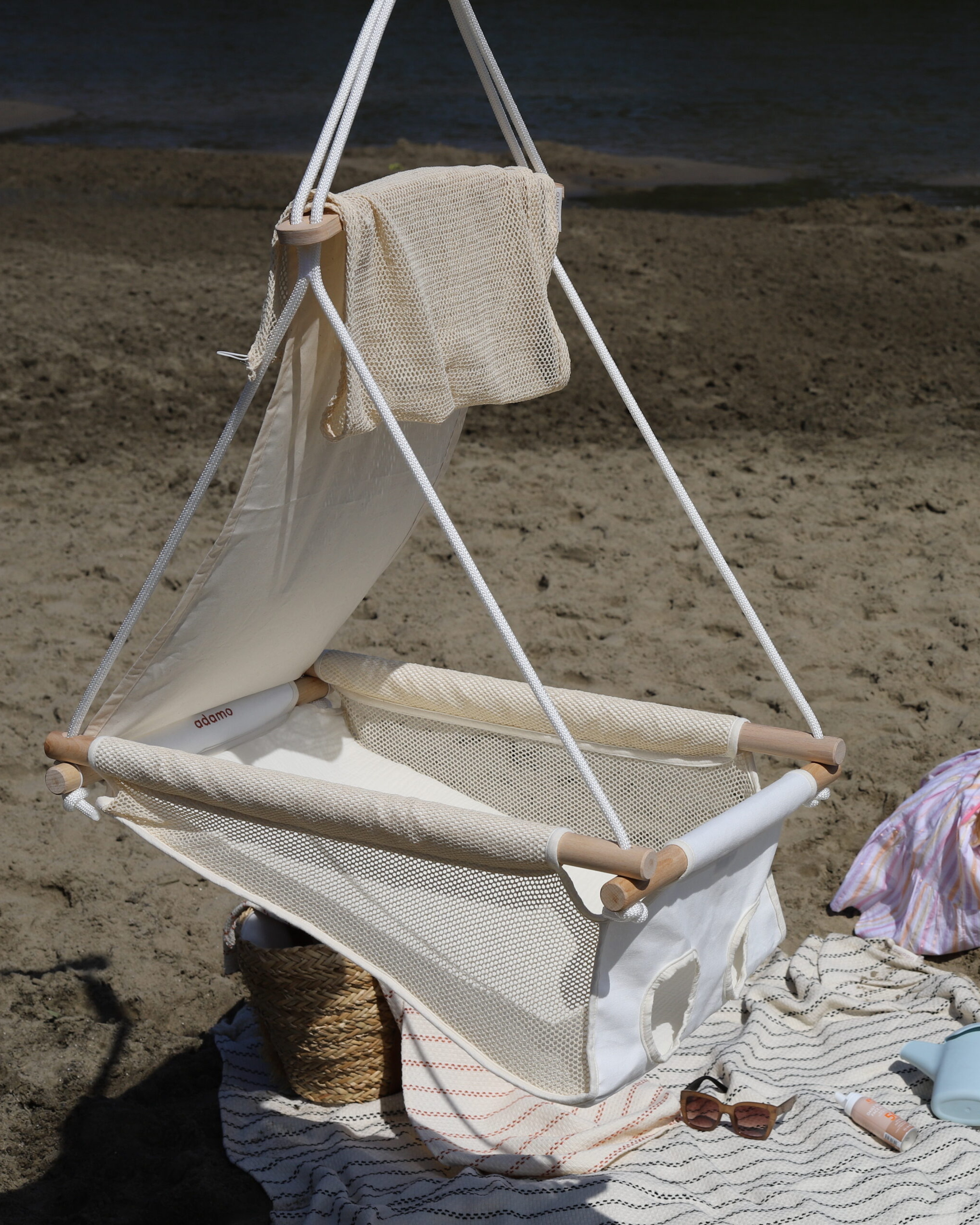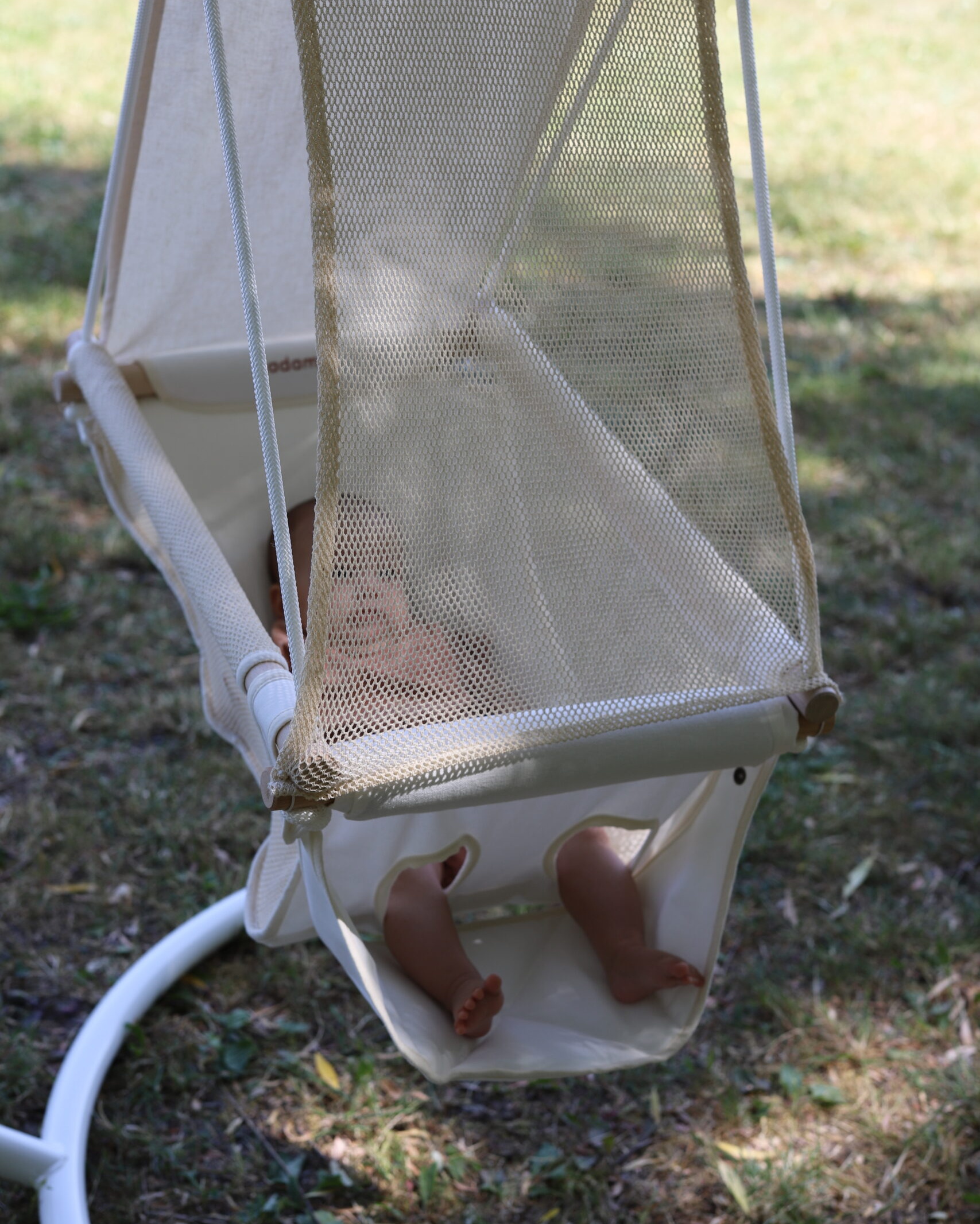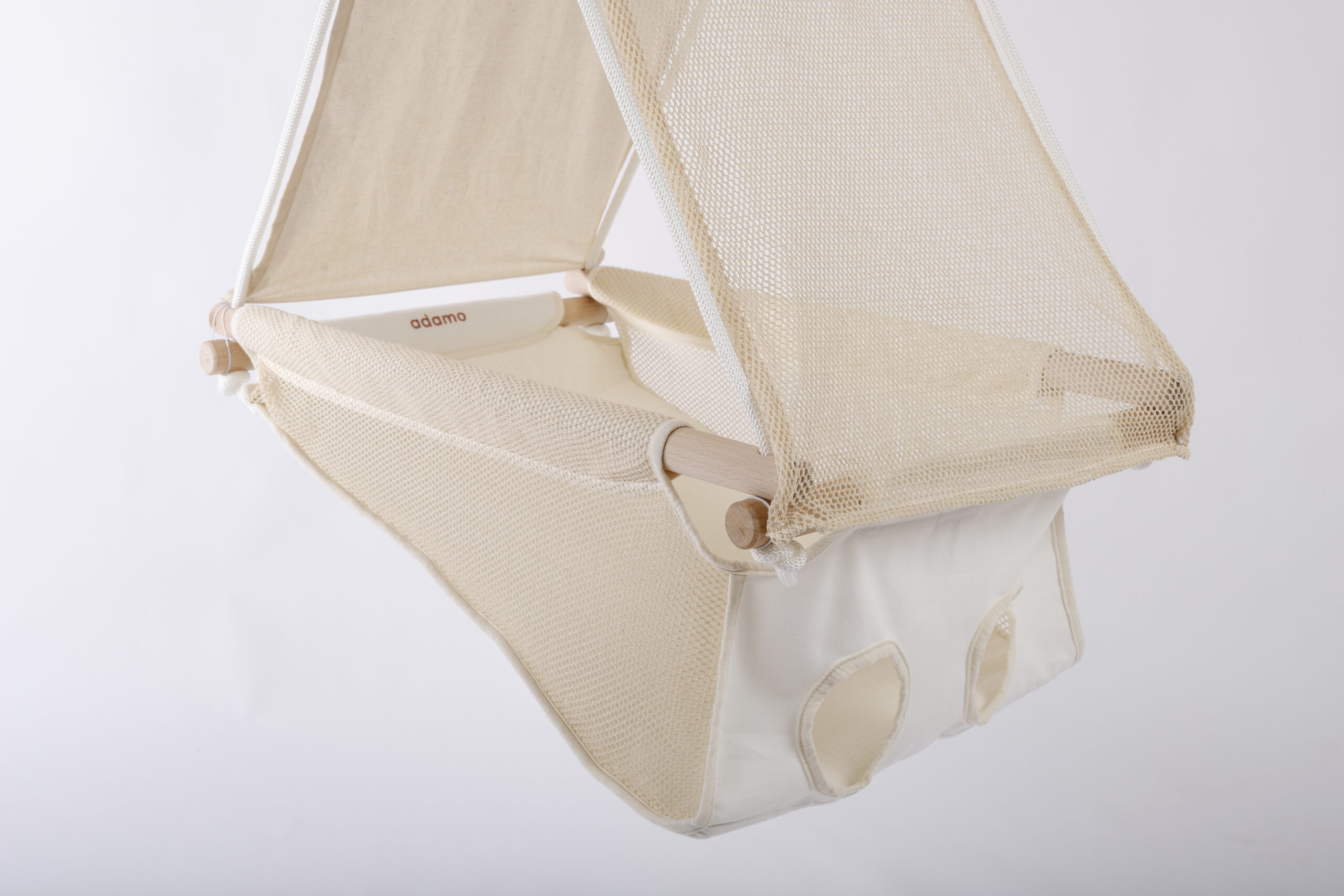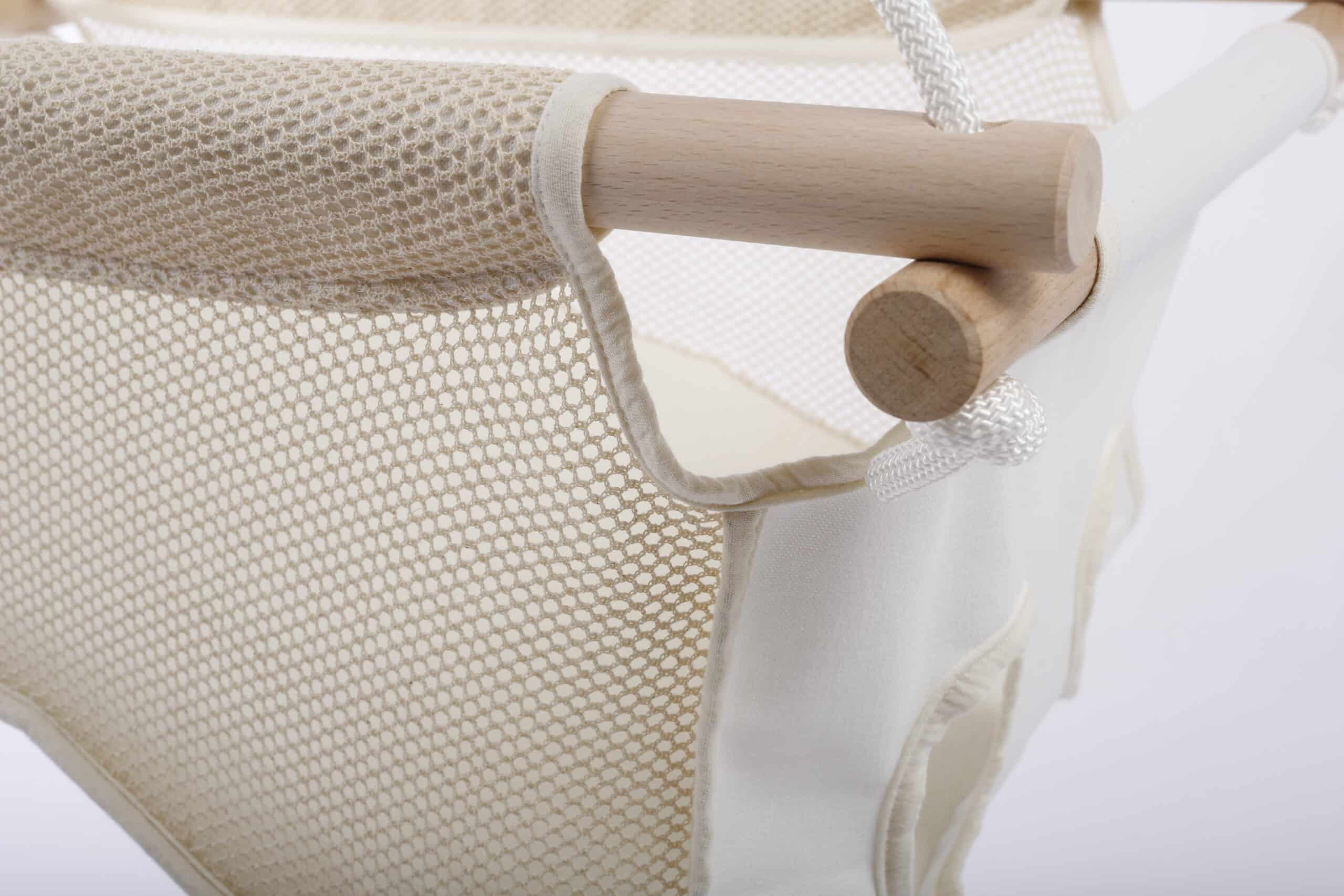 Az elülső rész egy légies, organikus natúr hálóból készült, amely vizuálisan is passzol az Adamo Summer babahinta stílusához, miközben megőrzi a hinta szellőzését és betekintést enged a hintába