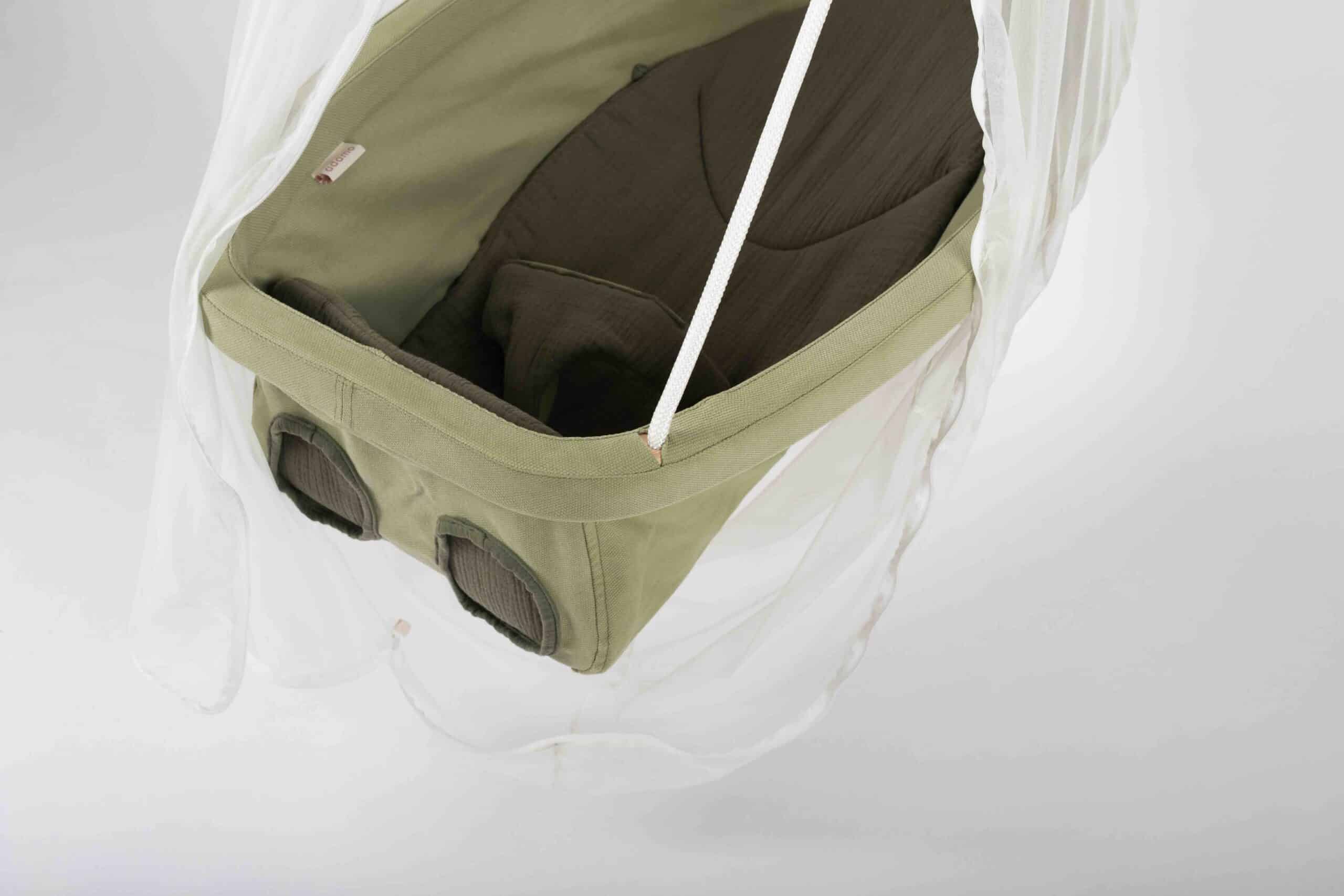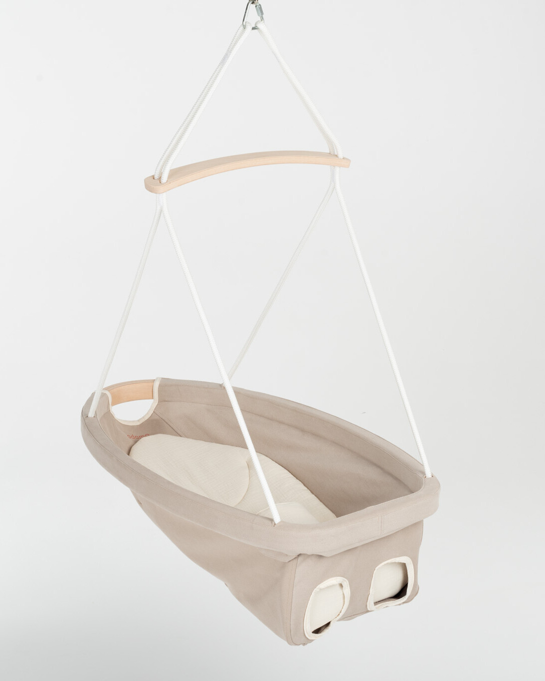 A hinta huzat része stabilan rögzített, úgy ahogyan a kötélvégződések is.  A lekerekített, ívelt hinta keretet, 100% környezetbarát, mosható, ÖKO-TEX minősítésű puha textillel borítottuk, a legjobb alvási és pihenési élmény érdekében. Összeszerelve, díszdobozban szállítjuk!